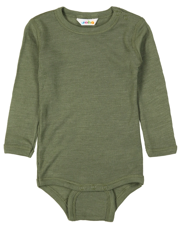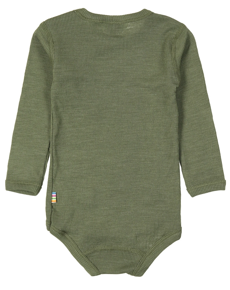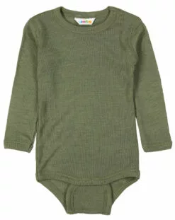 Der Langarm-Body 621 – WOOL in dark sage von Joha bietet dem kleinen Neuankömmling mit seinem leichten, feingerippten Stoff ein fantastisches Tragegefühl. Gleichzeitig passt sich die bequeme Babywäsche mit ihrer hohen Elastizität hervorragend an den Körper des Kindes.